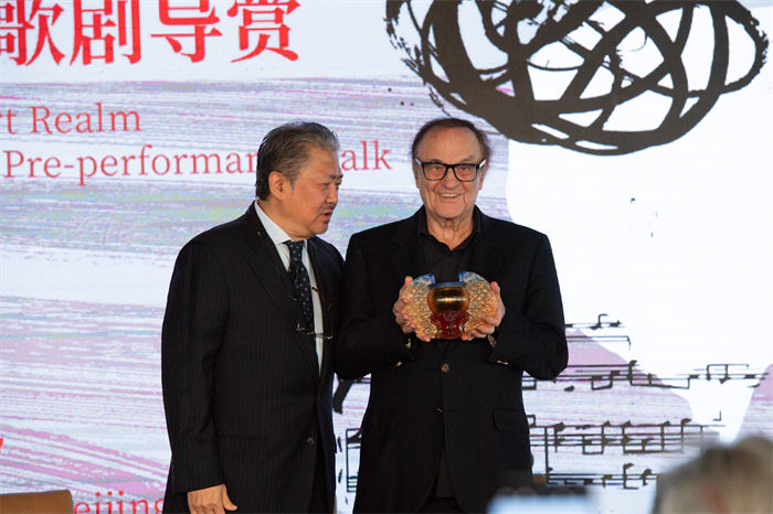 此次演出汇聚了世界顶级的艺术家阵容。最受瞩目的当属指挥大师夏尔·迪图瓦。尽管已89岁高龄,他依旧精神矍铄地站在乐池中,精准驾驭着贝尔格复杂而充满情感的乐谱。邹爽介绍,迪图瓦大师上一次在北京国际音乐节上指挥歌剧《浮士德的沉沦》之后就表示了指挥《沃采克》的强烈意愿,此番可谓是“如约而至”。作为已是第39次到访中国的“乐坛常青树”,迪图瓦在演出前一天的发布会上,从北京国际音乐节艺委会主席余隆手中接过了“年度艺术家”奖杯,以表彰其极高的艺术造诣和对音乐节的卓越贡献。