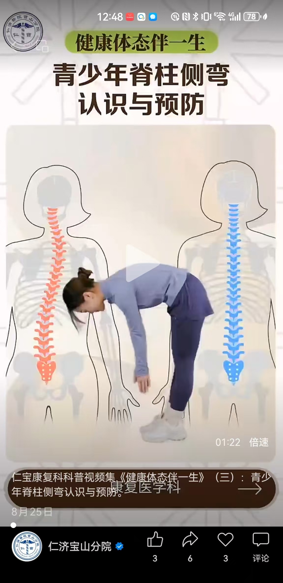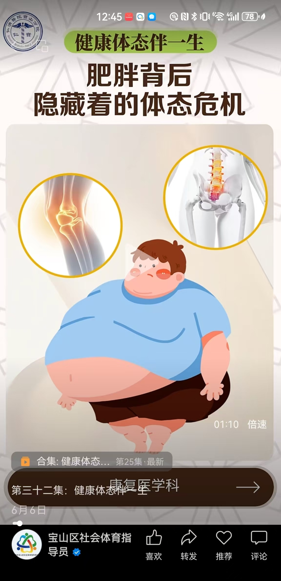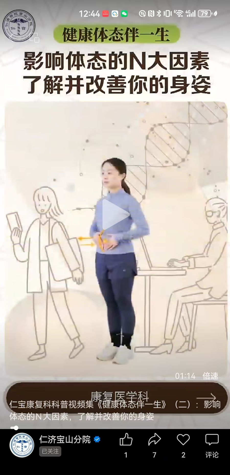 《健康体态伴一生》系列视频正是在此背景下应运而生,由上海交通大学医学院附属仁济医院宝山分院康复医学科打造。用户只要关注“仁济宝山分院”微信公众号,就能便捷获取这一专业的运动健康的科普资源。