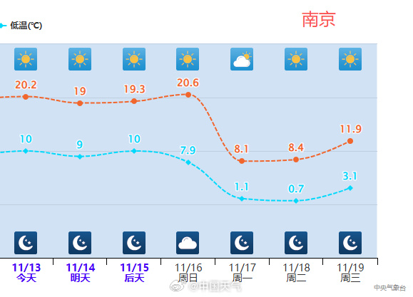 像南京等南方不少地方前一天还是20℃+,次日就猛降至10℃出头,南京最低气温甚至可能跌至0℃!这股强冷空气还将越过南岭,给华南带去降温,气温跌落“2”字头!